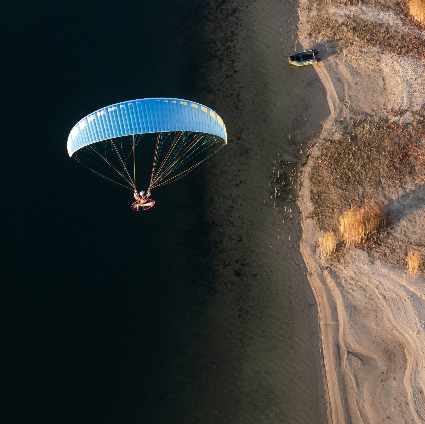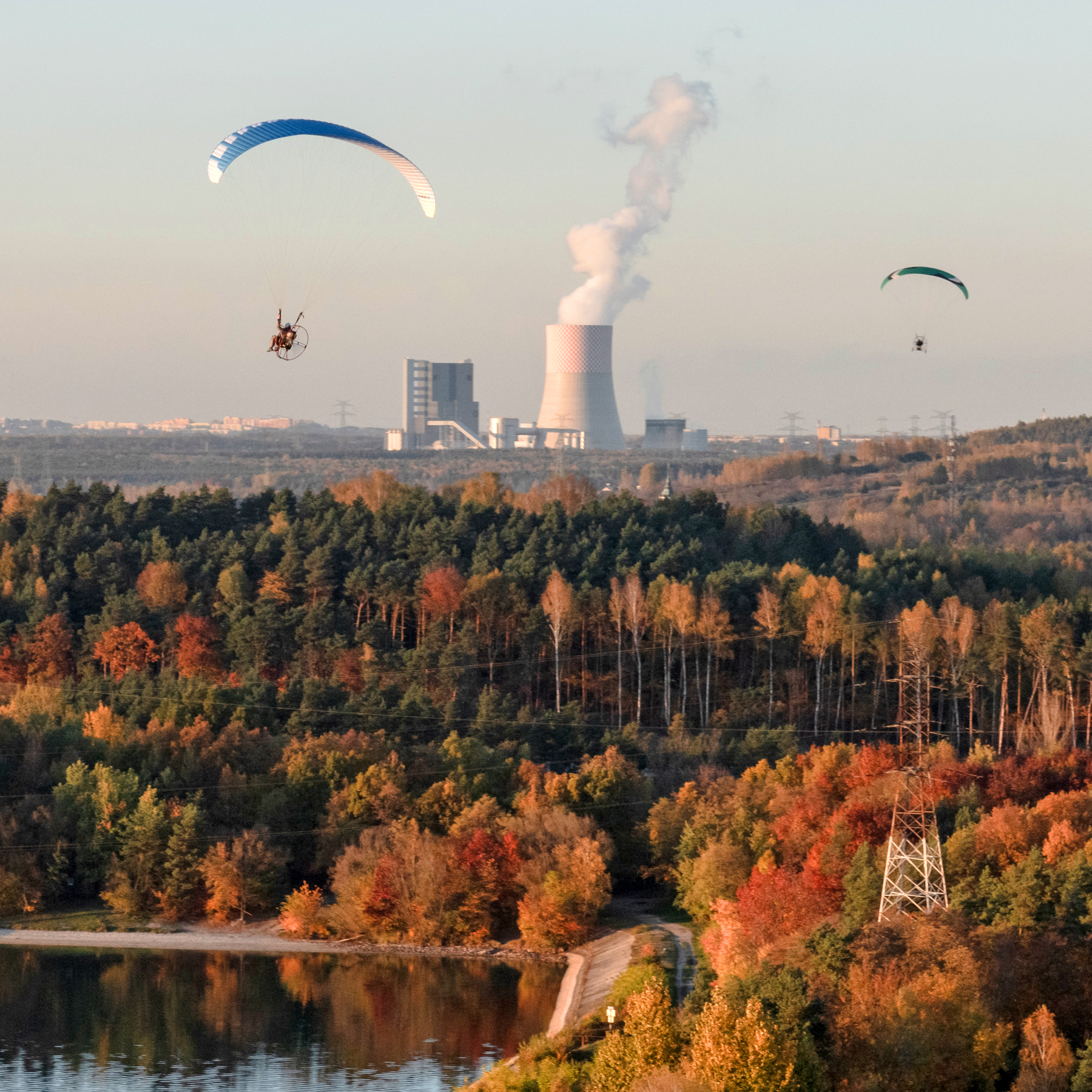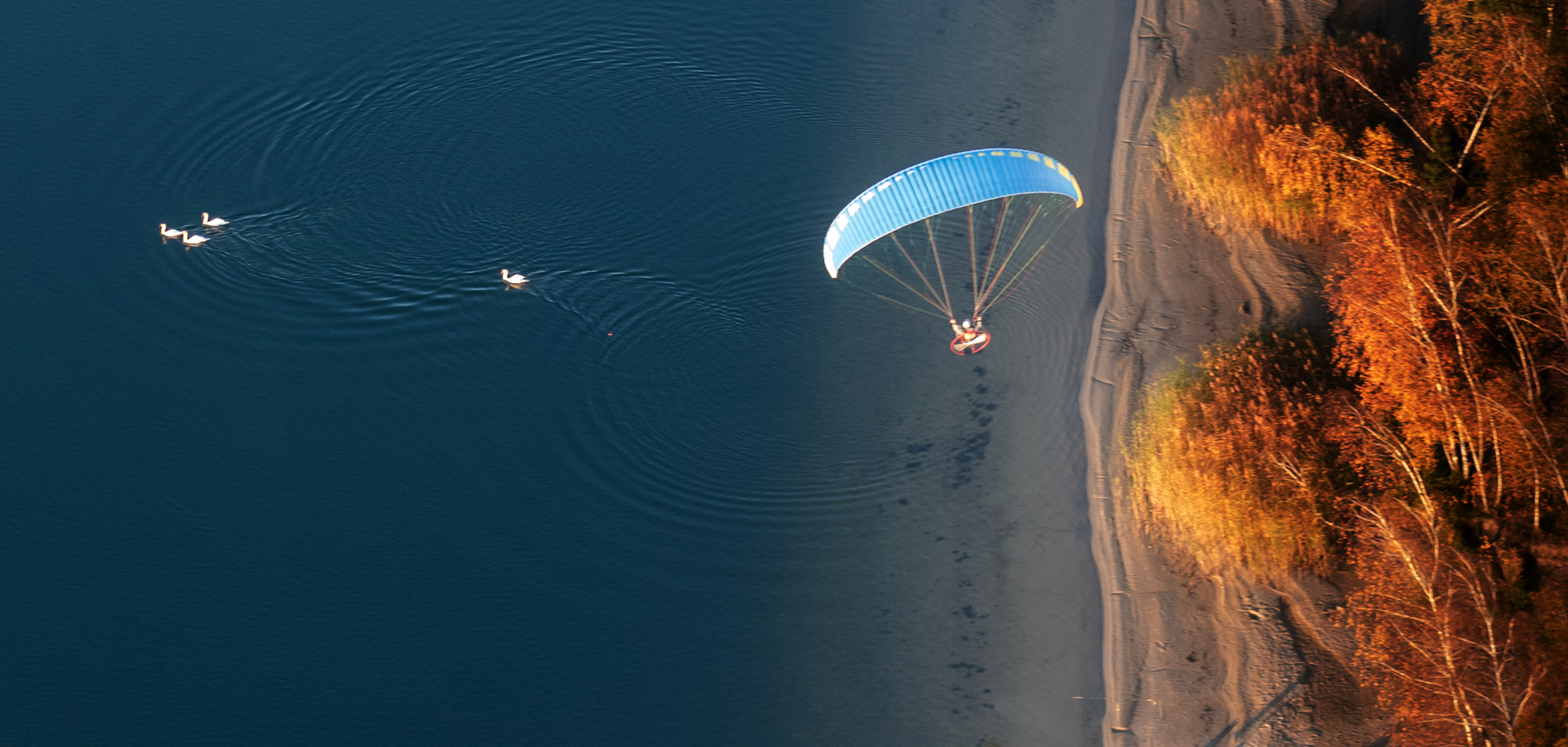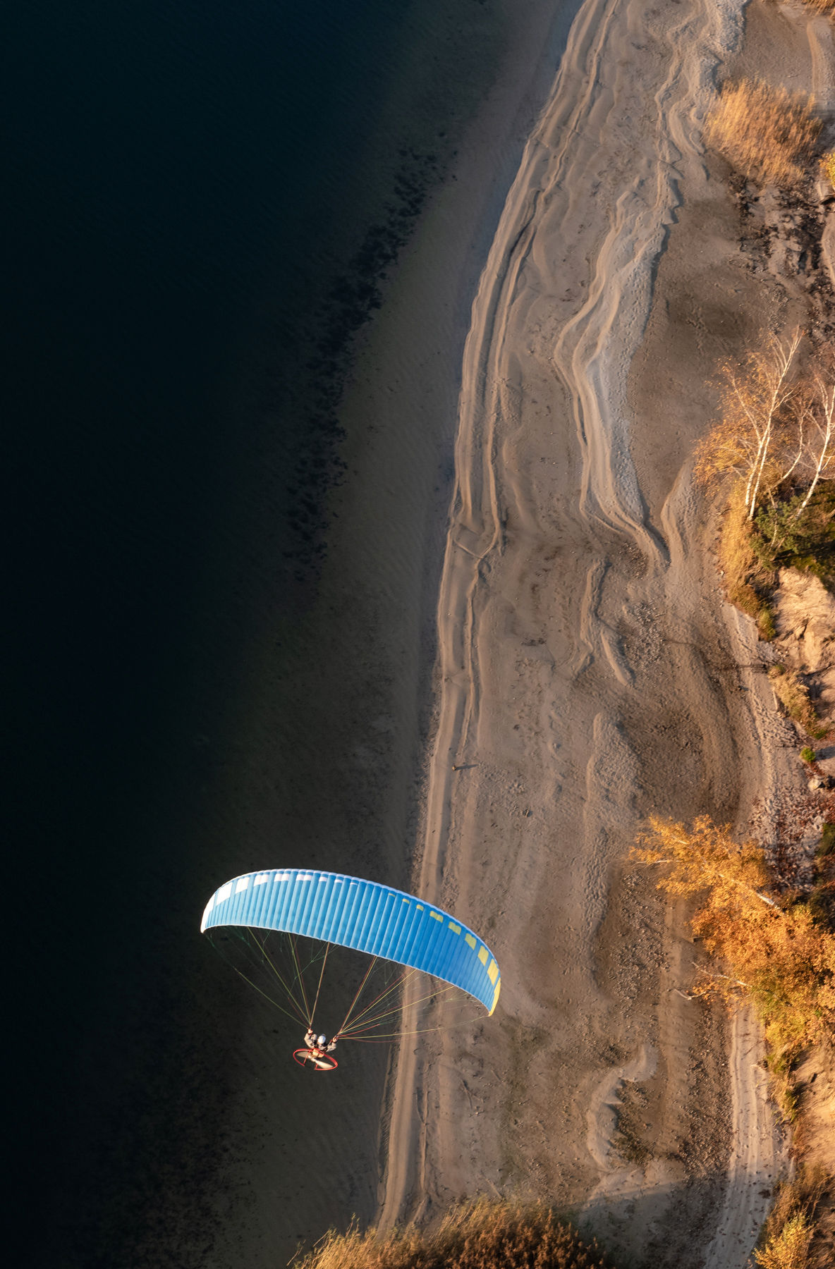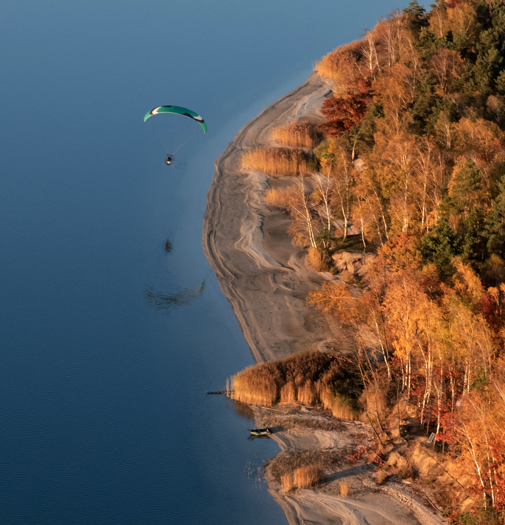 W październiku jest kilka dni w czasie których wszystko nam sprzyja. Obłędne ogniste kolory kontrastujące z błękitem nieba i granatem wody. Cisza na drzewach i brak termy, która powoduje nieprzyjemne bujanie. Loty są spokojne, magiczne - jedne z najlepszych w roku. Wybraliśmy na zbiornik Dziećkowice. Trasa dla nas pospolita bo blisko od naszego lotniska. Tym razem było jednak wyjątkowo.